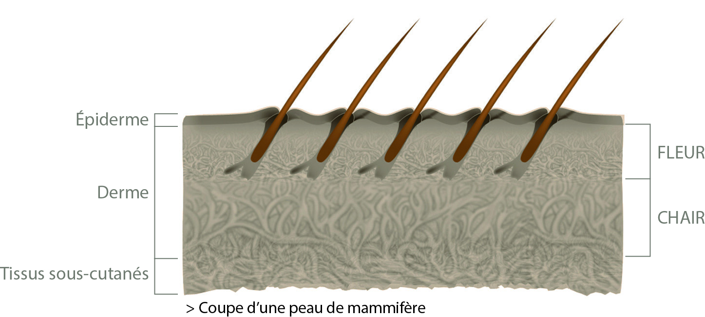 La peau animale est constituée de trois couches : l’épiderme, le derme et les tissus sous-cutanés.