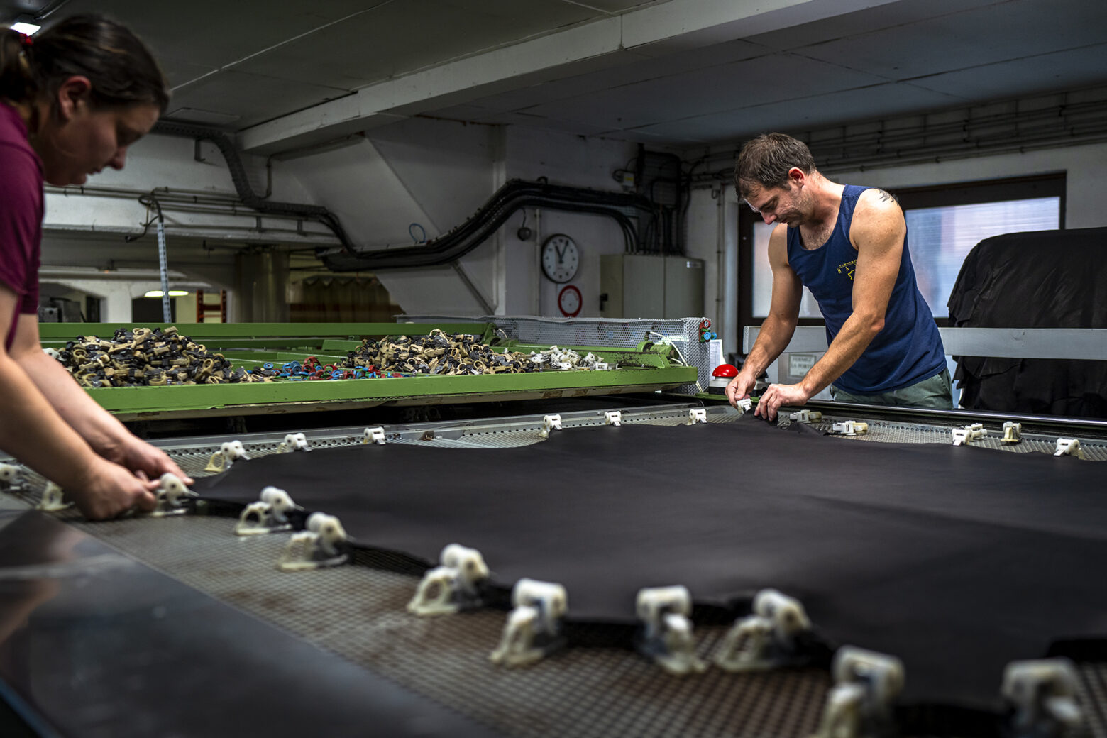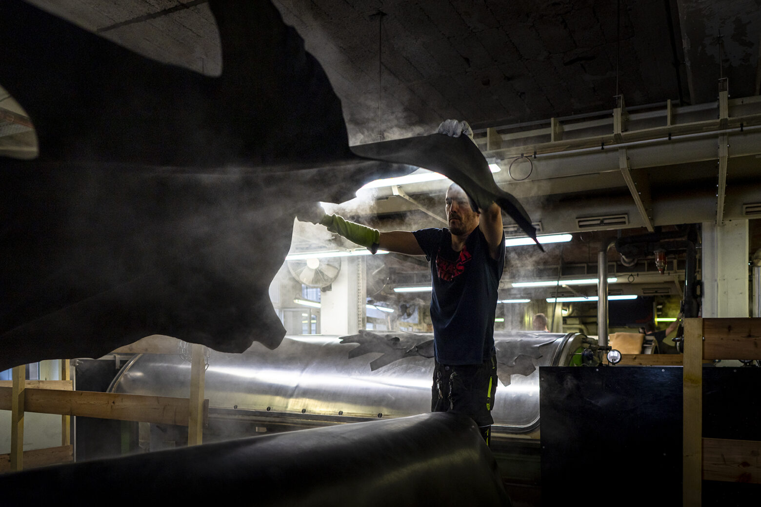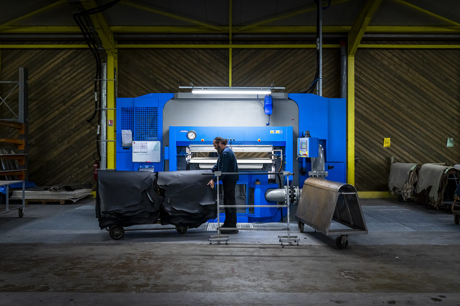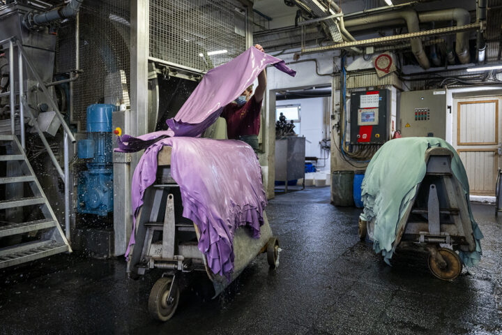 Pour passer d’une peau brute à un cuir fini, cette transformation nécessite l’utilisation de nombreuses machines.