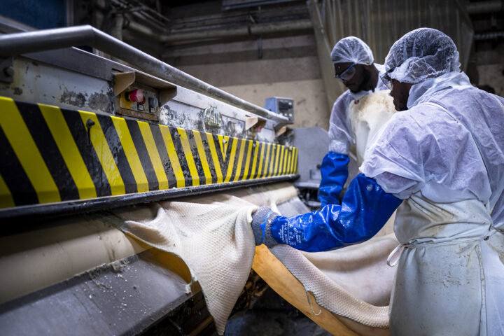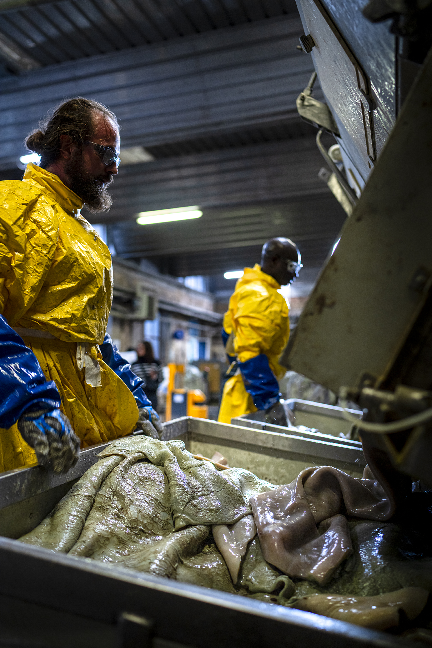 À l’issue de ce travail de rivière, il ne reste de la composition de la peau que le derme, qui sera transformé en cuir après tannage.